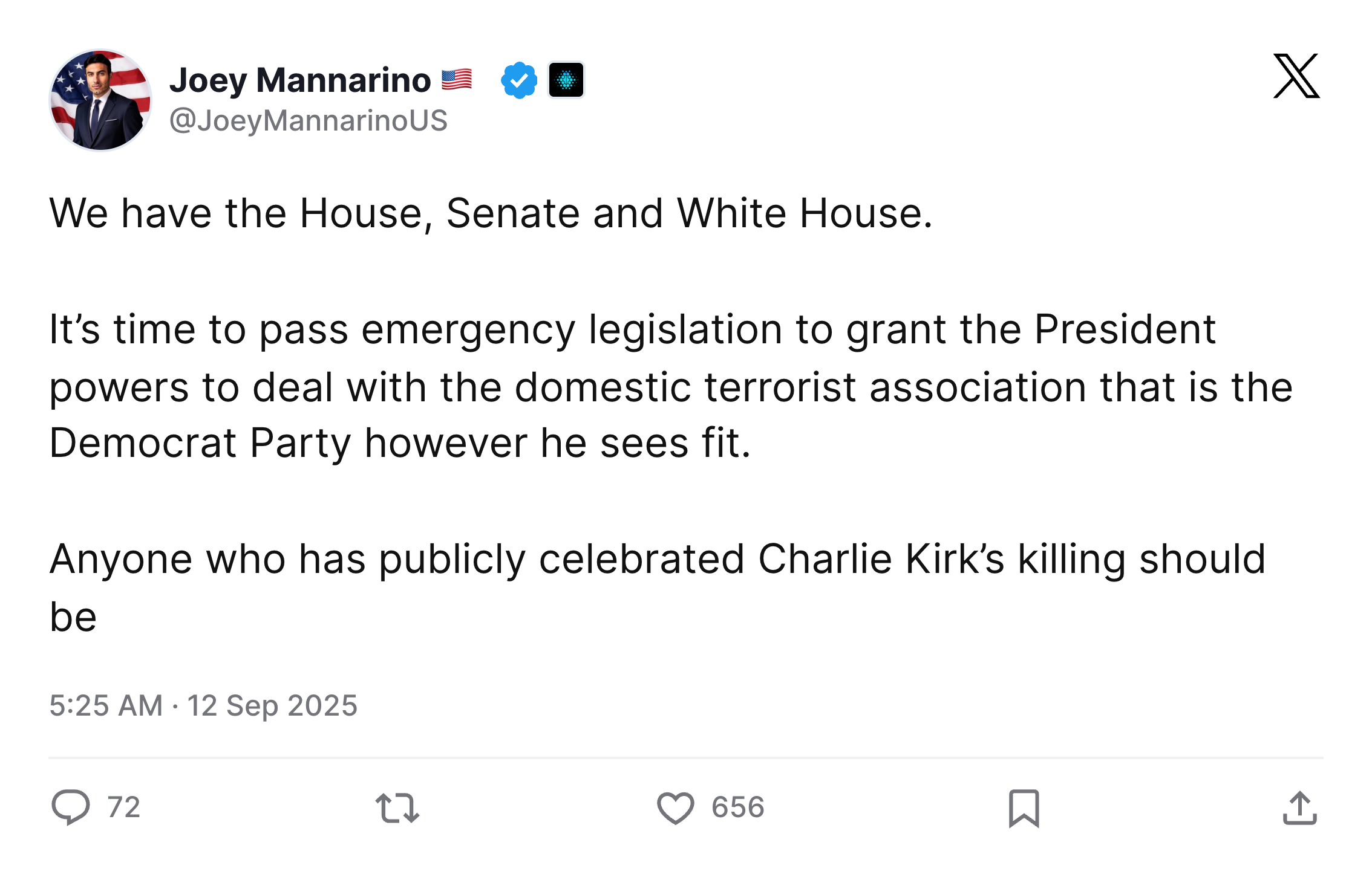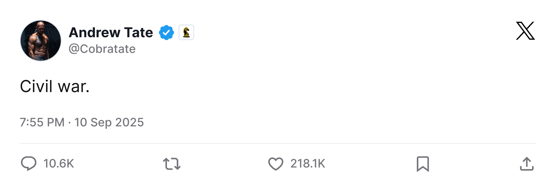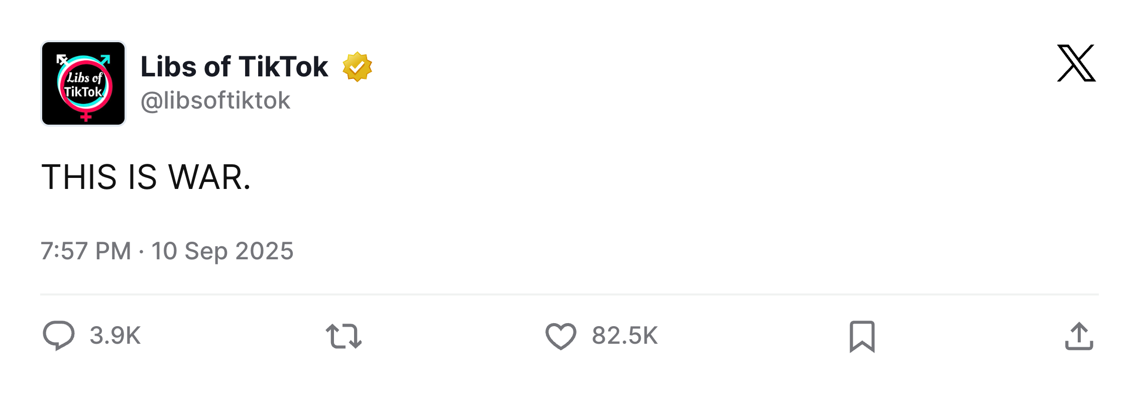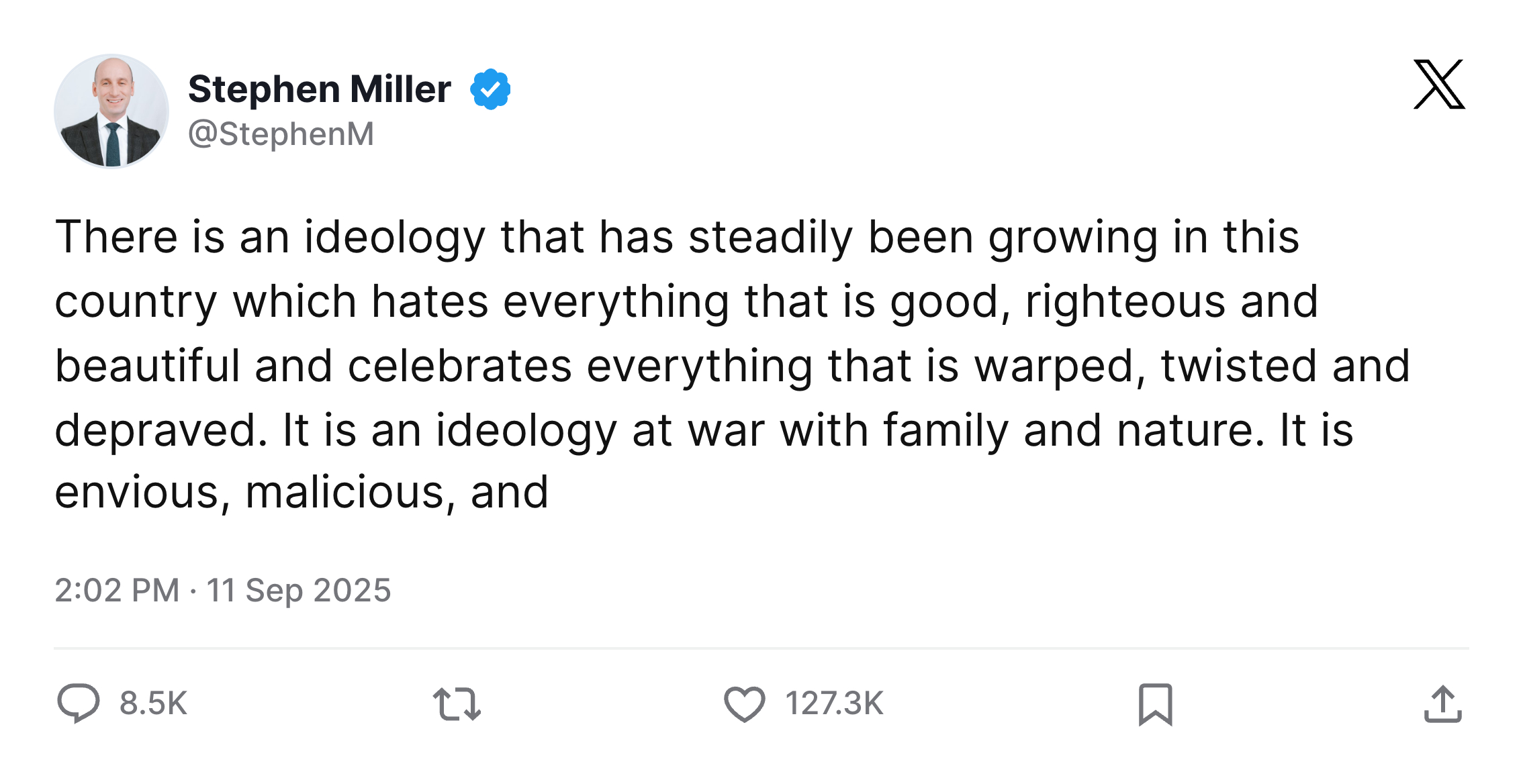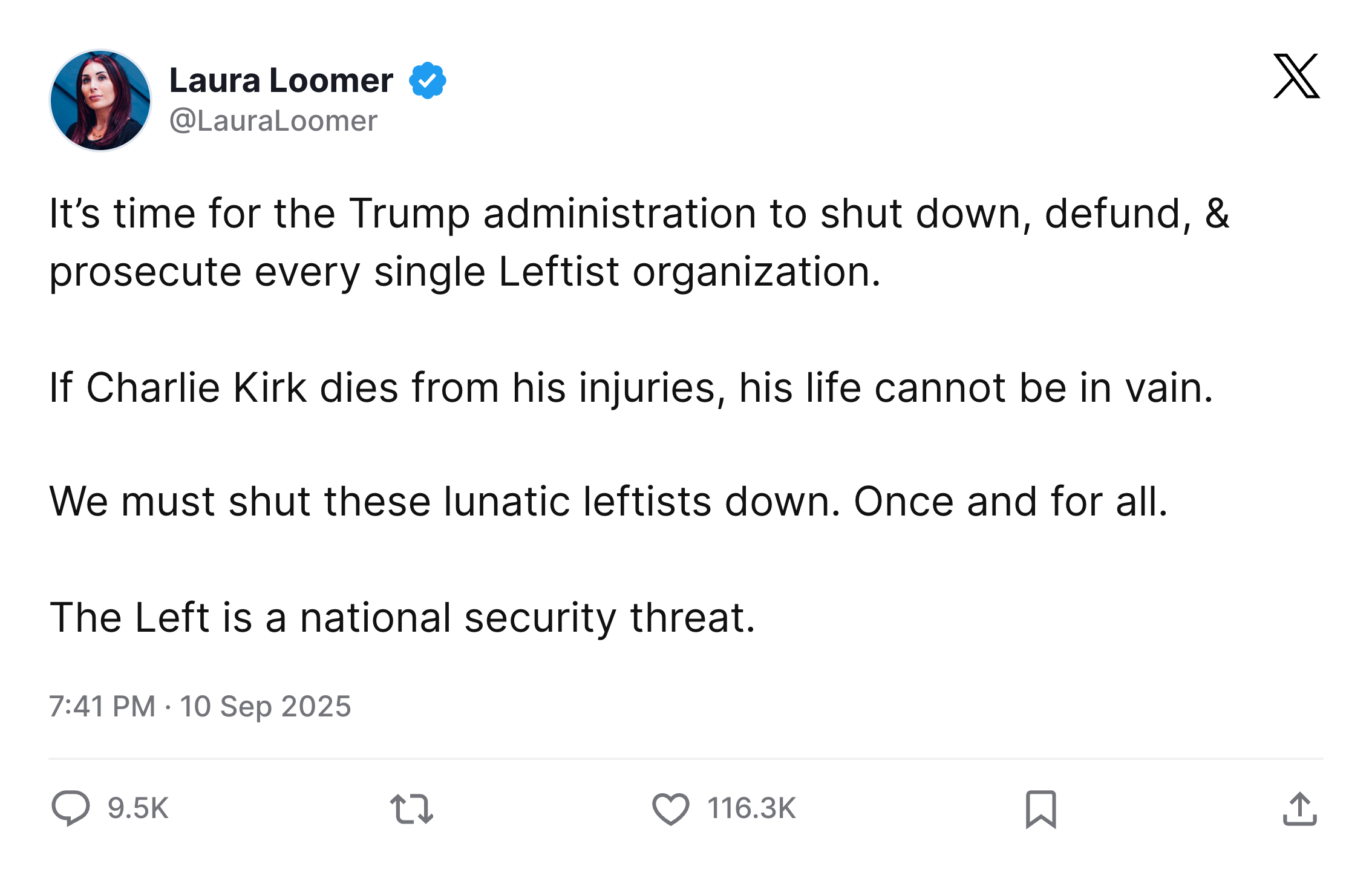 The loudest online right-wing reactions went further. Chaya Raichik, the founder of the anti-LGBTQ group "LibsOfTikTok" posted, "THIS IS WAR." Elon Musk called the left "the party of murder." Laura Loomer, a conservative influencer who is considered an unofficial advisor to the President, said that the administration should "shut down, defund, and prosecute every single Leftist organization." Andrew Tate, another high-profile conservative voice, called for civil war. Even Stephen Miller, the President's Deputy Chief of Staff, chimed in. These aren't anonymous troll accounts; these are people with real megaphones and power. What they're exhibiting isn't leadership in this moment – it's pouring gasoline on the fire.